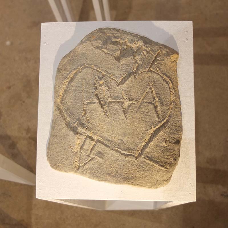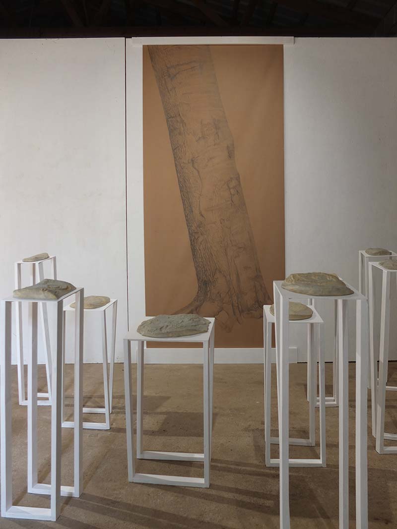 Eingeschnitten Bleistiftzeichnung von einem Buchenstamm (300x125cm) und zehn schiefe Pult-Tischchen mit Betonabgüssen von eingeritzten Initialien in Baumrinde (Höhe 68 bis105cm)